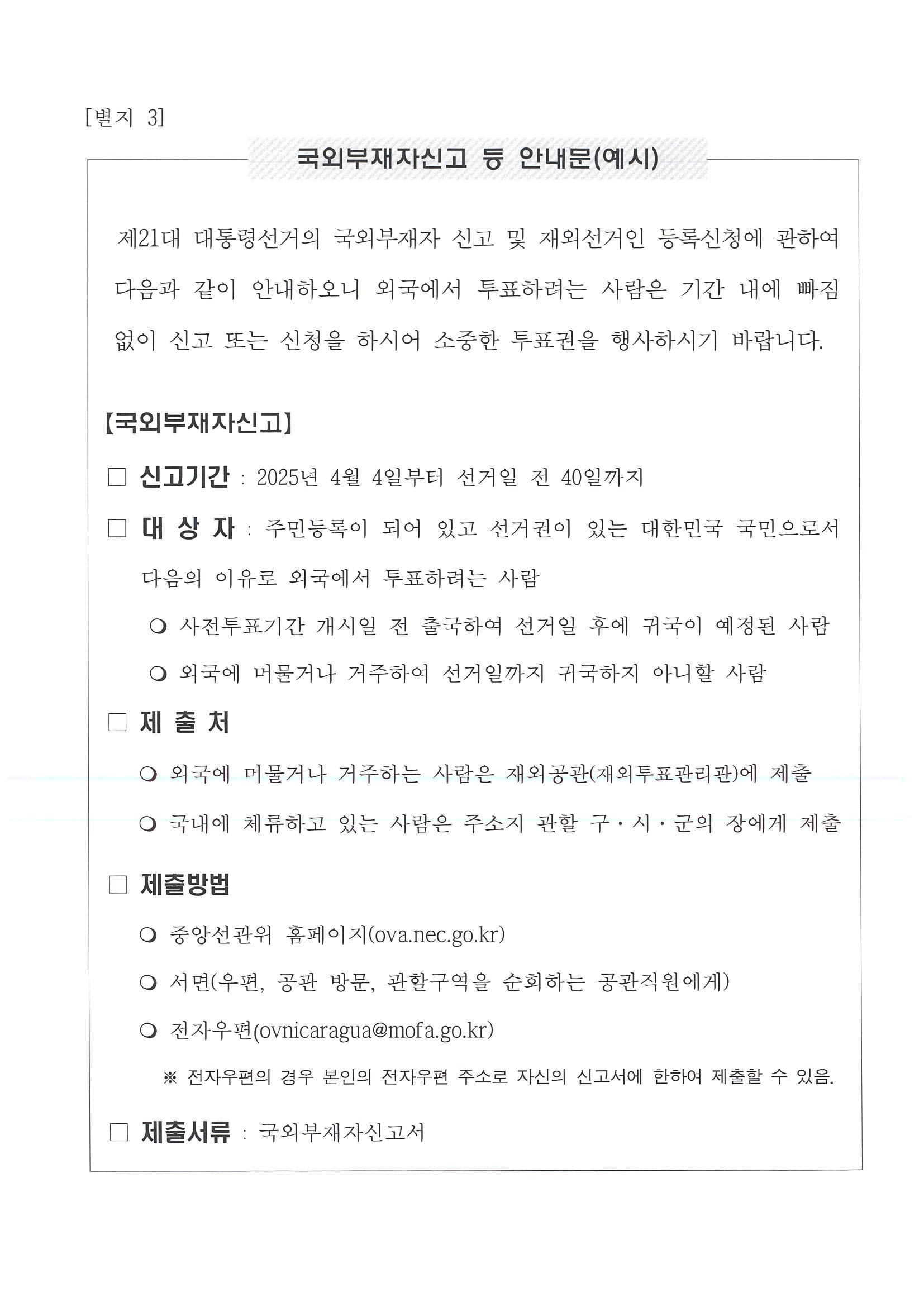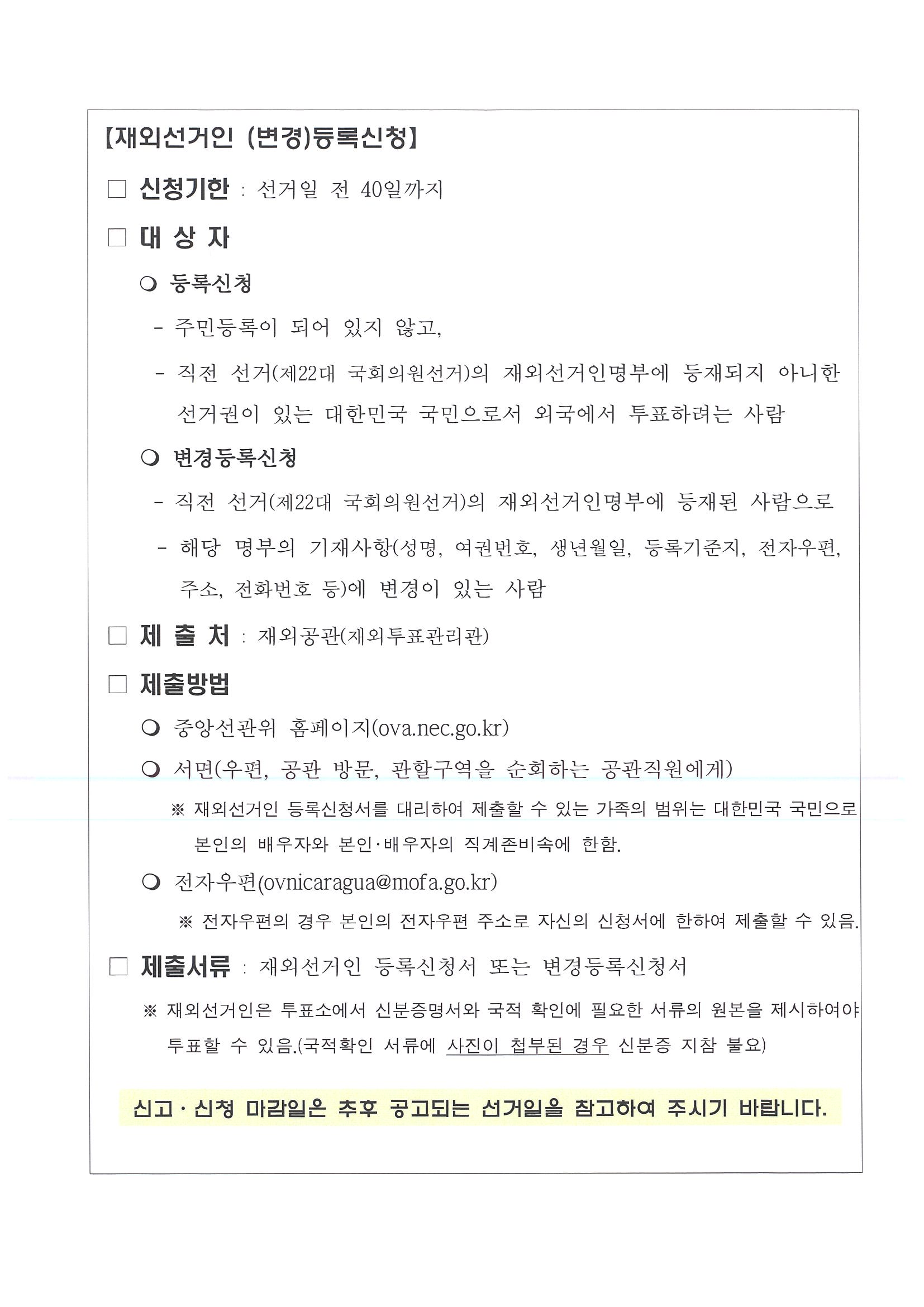 제21대 대통령선거의 국외부재자 신고 및 재외선거인 등록신청에 관하여 다음과 같이 안내하오니 니카라과에서 투표하려는 사람은 기간 내에 빠짐없이 신고 또는 신청을 하시어 소중한 투표권을 행사하시기 바랍니다.
