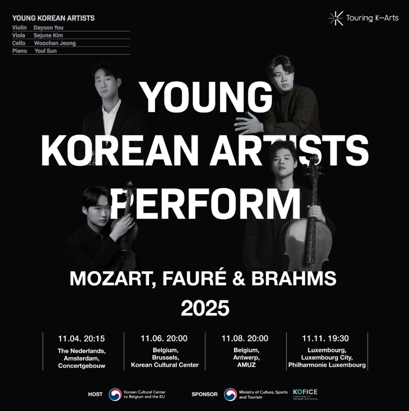 The Korean Cultural Center in Belgium, with the support of the Ministry of Culture, Sports and Tourism and the Korean Foundation for International Cultural Exchange (KOFICE), presents “Young Korean Artists Perform” on 4 November at 20:15 at the Concertgebouw in Amsterdam. Pianist Dayoon You, violinist Sejune Kim, violist Woochan Jeong, and cellist Youl Sun will perform piano quartets by Mozart, Fauré, and Brahms. For more information and ticket reservations, please visit the link here.
