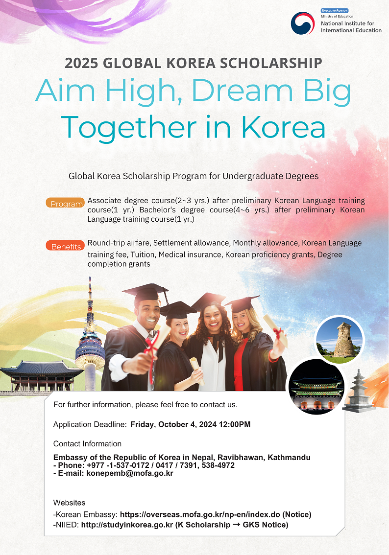 국립국제교육원은 2025 GKS(Global Korea Scholarship) 정부초청 학부 장학생 선발을 의뢰해온바, 붙임 자료를 참고하시어 공관 전형에 관심 있는 네팔 국적 학생은 신청하여 주시기 바랍니다.