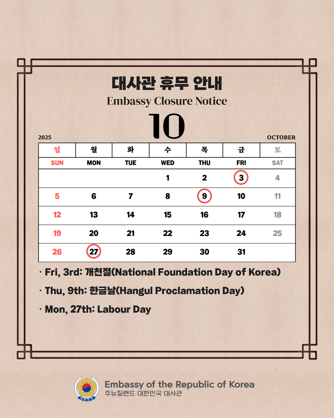 The Embassy of the Republic of Korea will be closed on Friday, 3rd October, Thursday, 9th October, and Monday, 27th October.