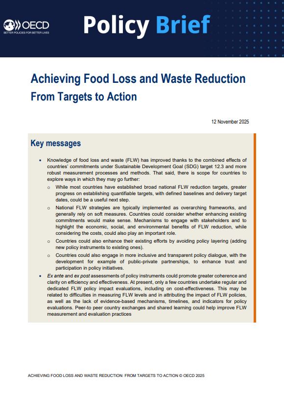 OECD (2025), “Achieving food loss and waste reduction: From targets to action”, OECD Policy Briefs, No. 39, OECD Publishing, Paris, https://doi.org/10.1787/edd99594-en