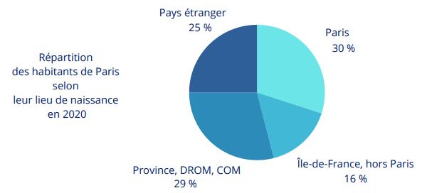 행정구역별 세분화된 통계가 이루어지기 시작한 1968년 당시 파리 시민 가운데 35%가 파리에서 태어난 사람이었으나, 이 비율은 1970년대를 거치며 감소했고, 1982년부터는 약 31%, 2020년에는 30%를 유지하고 있다. 파리와 일드프랑스를 제외한 기타지역 출신은 1968년에는 38%를 차지했지만, 2020년에는 29%로 줄어들었다.
