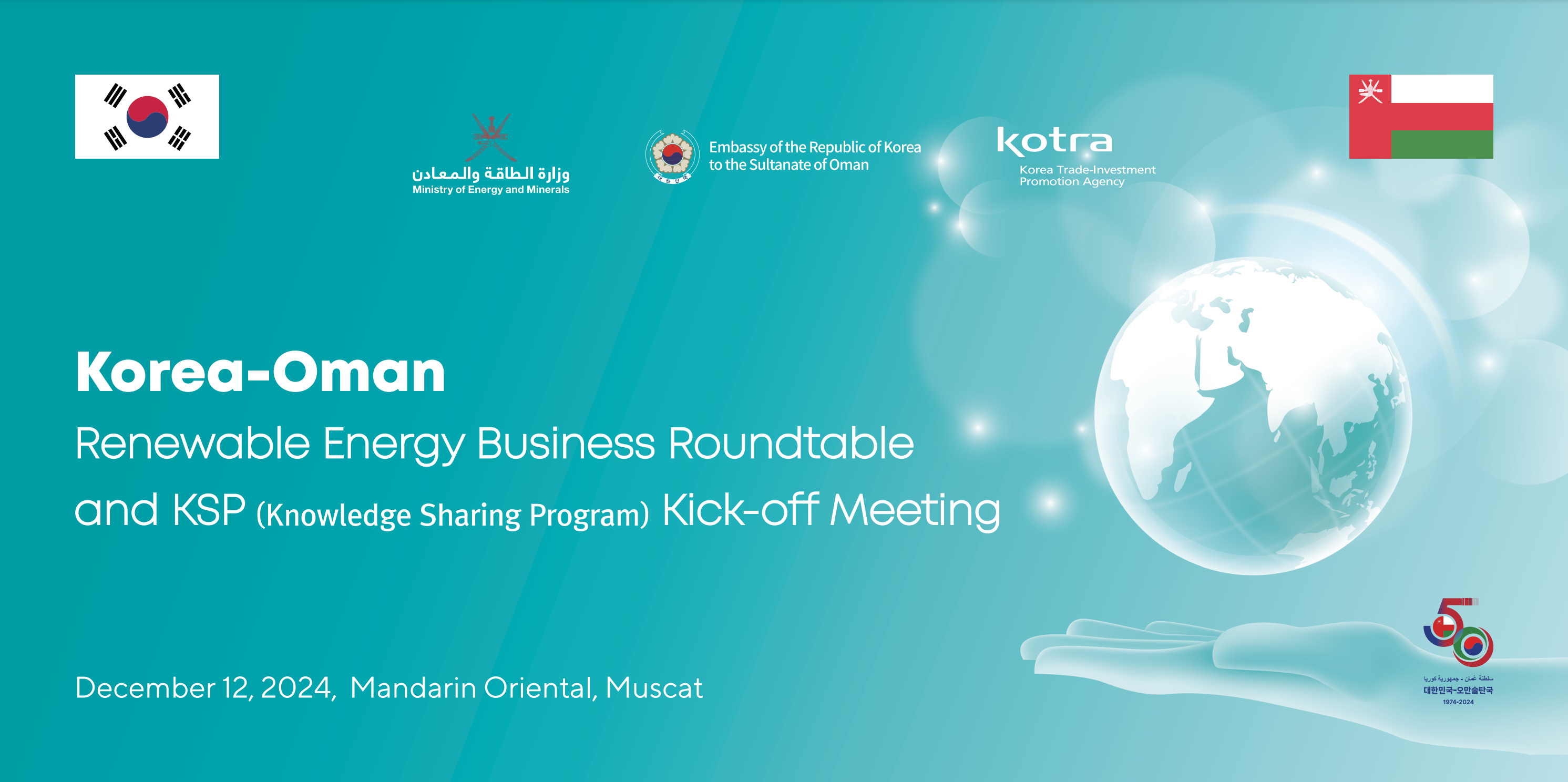 The Embassy of the Republic of Korea in Oman, in collaboration with the Ministry of Energy and Minerals of the Sultanate of Oman and the Korea Trade-Investment Promotion Agency (KOTRA), hosted the “Korea-Oman Renewable Energy Business Roundtable and KSP (Knowledge Sharing Program) Kick-off Meeting” in Muscat on Thursday, December 12.