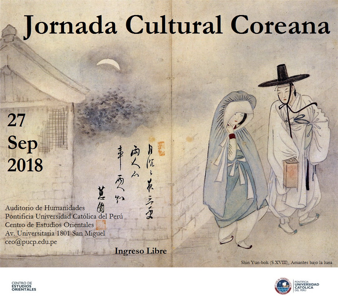 La Embajada de la República de Corea en Perú tiene el honor de invitarlos a Jornada Cultural Coreana que se llevará a cabo el jueves 27 de septiembre en el Auditorio de Humanidades, en el campus PUCP. El ingreso es libre y es necesario inscribirse(http://departamento.pucp.edu.pe/humanidades/inscripciones/?id=11272). El evento contará con la siguiente programación: