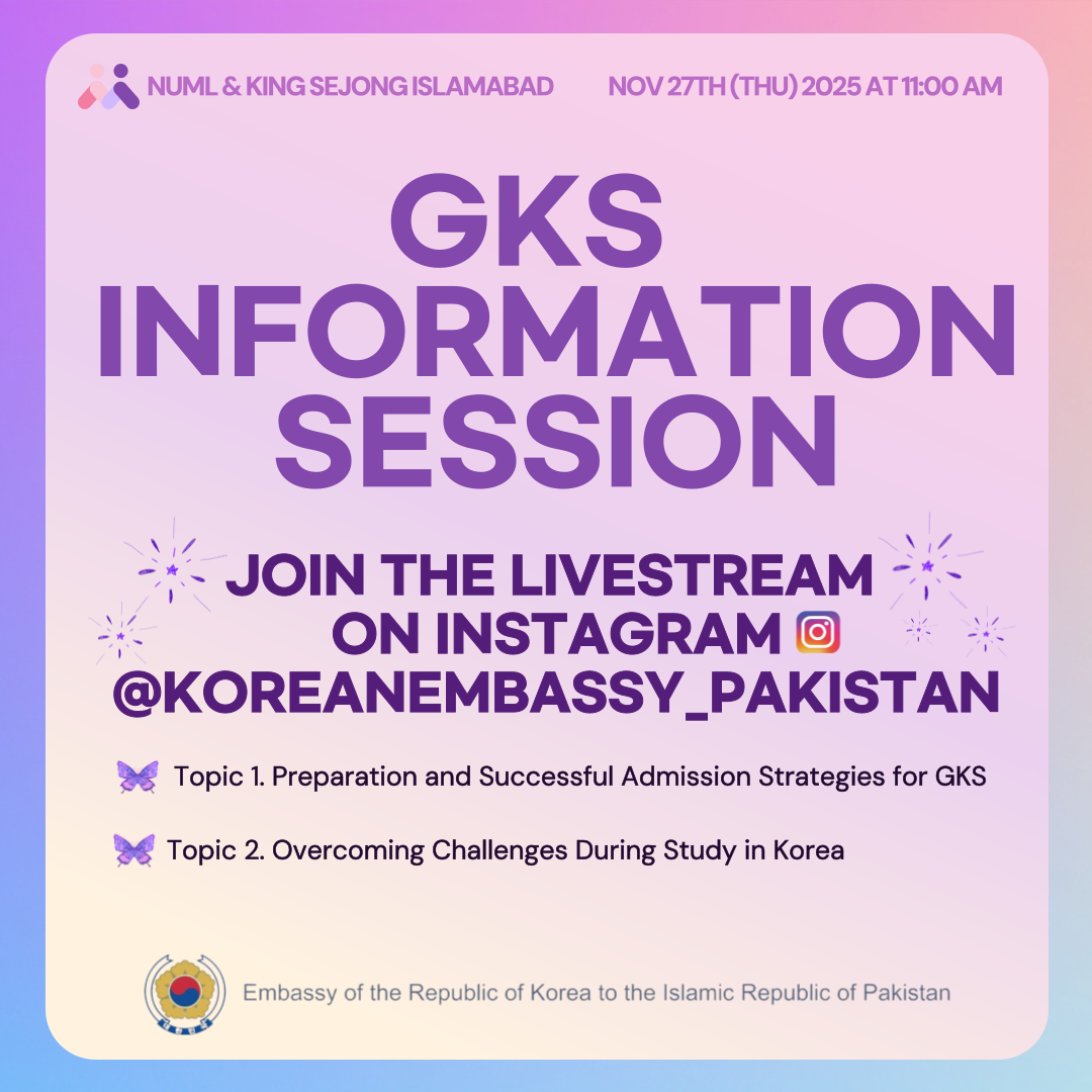 11.27.(목) 우리 대사관은 파키스탄 국립외국어대학교(NUML)에서 이슬라마바드 세종학당과 공동으로 GKS 동문회 및 설명회를 개최하였습니다.