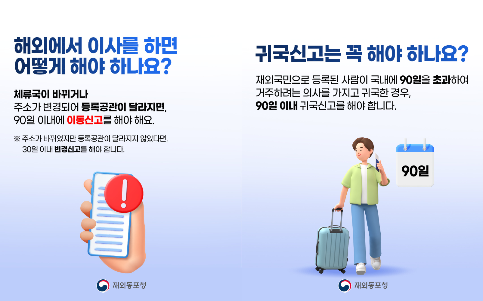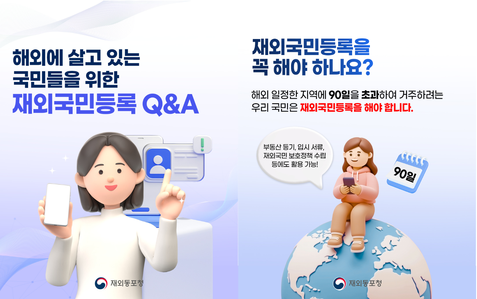 ※「재외국민등록법」제2조(등록대상) 외국의 일정한 지역에 계속하여 90일을 초과하여 거주하거나 체류할 의사를 가지고 그 지역에 체류하는 대한민국 국민은 이 법을 따라 등록하여야 한다.