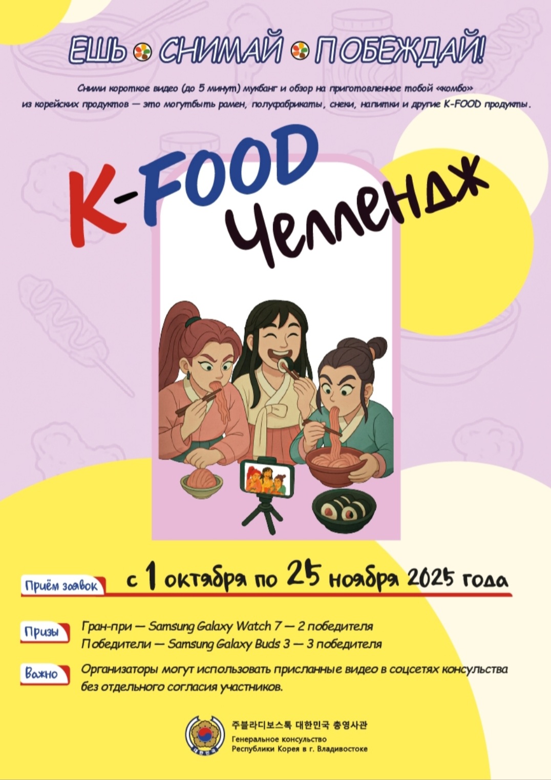 Сними короткое видео (до 5 минут) мукбанг и обзор на приготовленное тобой «комбо» из корейских продуктов — это могут быть рамен, полуфабрикаты, снеки, напитки и другие K-FOOD продукты.