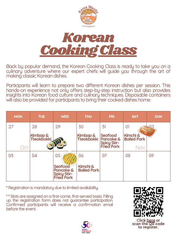 The Embassy of the Republic of Korea is excited to present the 2025 Korean Cuisine Week, a delicious showcase of Korea's rich food culture and history, as part of Korea Weeks in Singapore.
