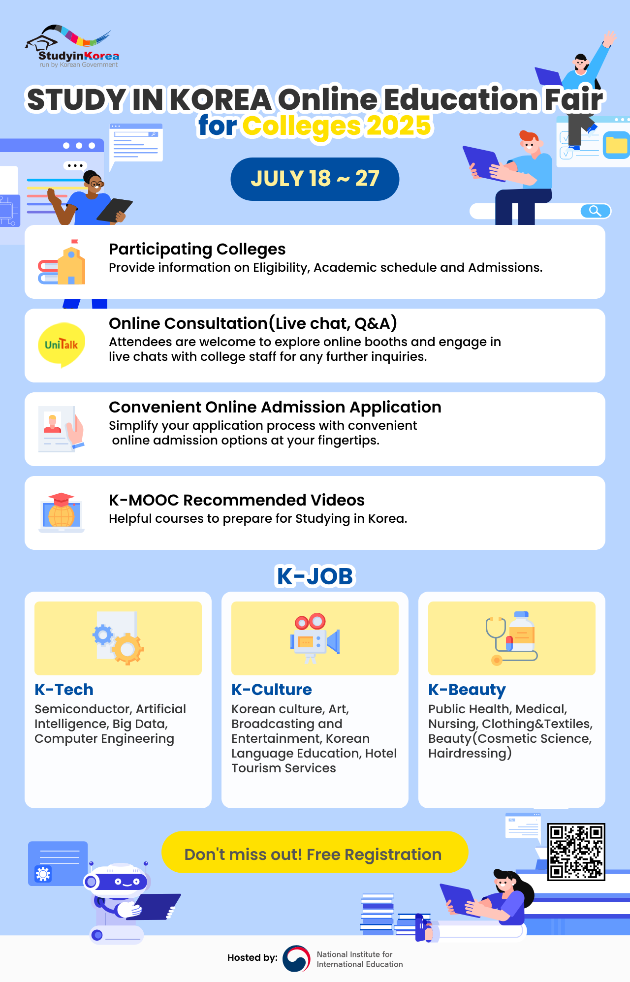Centrum „Study in Korea“ v Národnom inštitúte pre medzinárodné vzdelávanie organizuje zahraničný veľtrh štúdia v Kórei s cieľom rozšíriť a diverzifikovať nábor vynikajúcich zahraničných študentov. V tejto súvislosti sa uskutoční „Špecializovaný veľtrh štúdia v Kórei 2025 pre vysoké odborné školy (online)“ s cieľom poskytnúť bližšie informácie o vysokých odborných školách. Tešíme sa na vašu účasť.