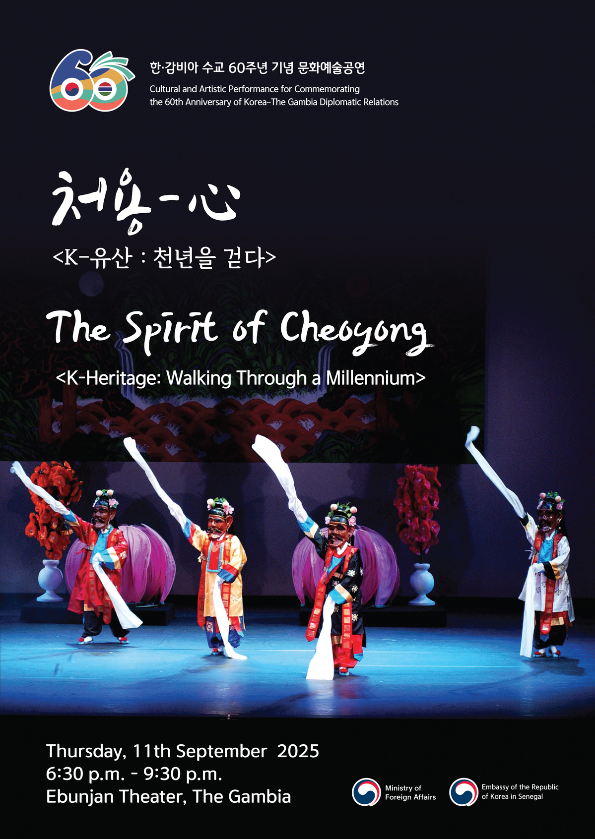 우리 대사관은 한-감비아 수교 60주년을 기념하여, 오는 2025년 9월 11일 목요일, 감비아에서 “처용-心 <K-유산 : 천년을 걷다>"을 주제로 문화예술공연을 개최합니다.
