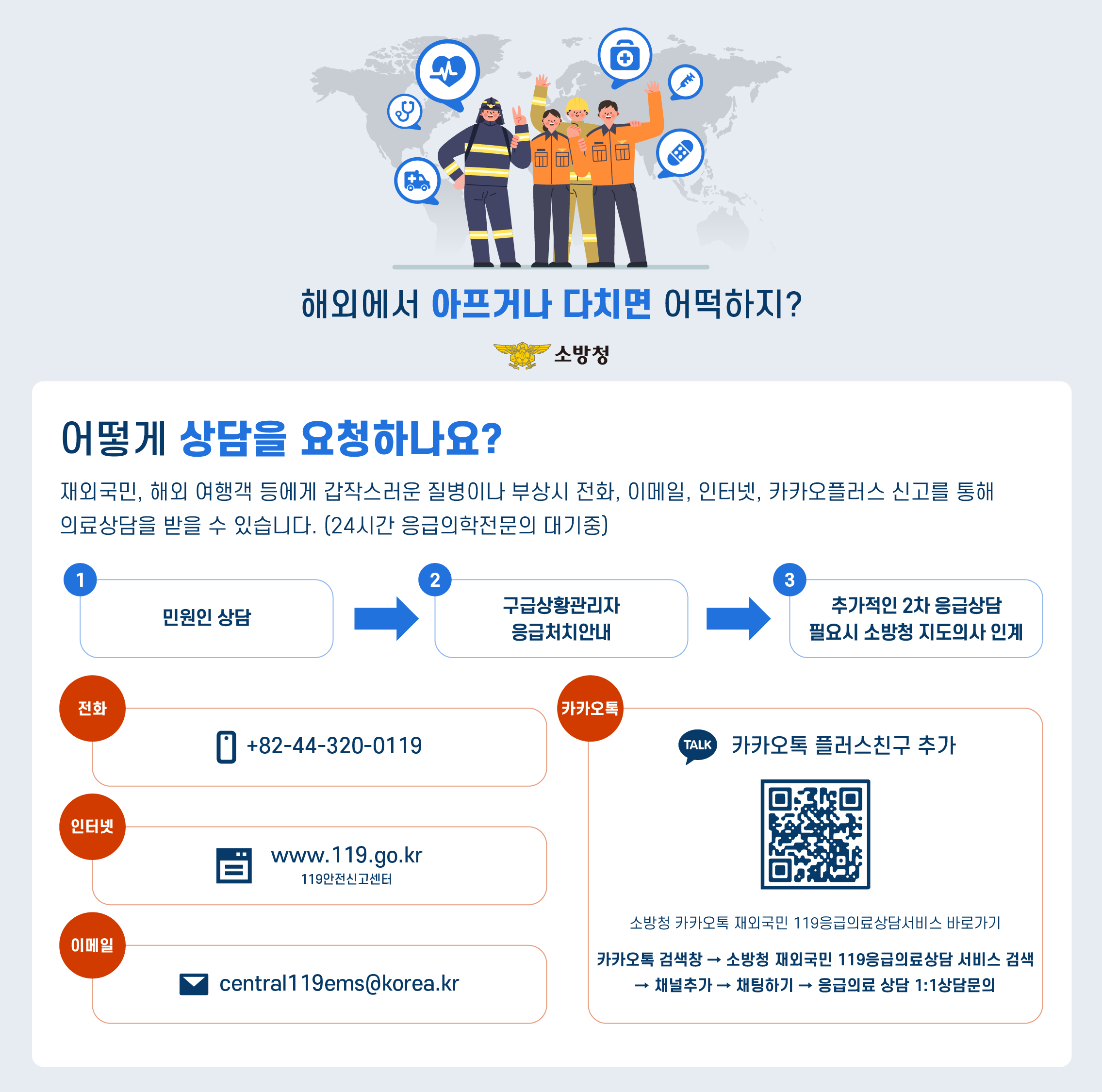 소방청 중앙119구급상황관리센터에서 운영 중인 119안전신고센터 재외국민 응급의료상담 서비스를 안내드립니다.