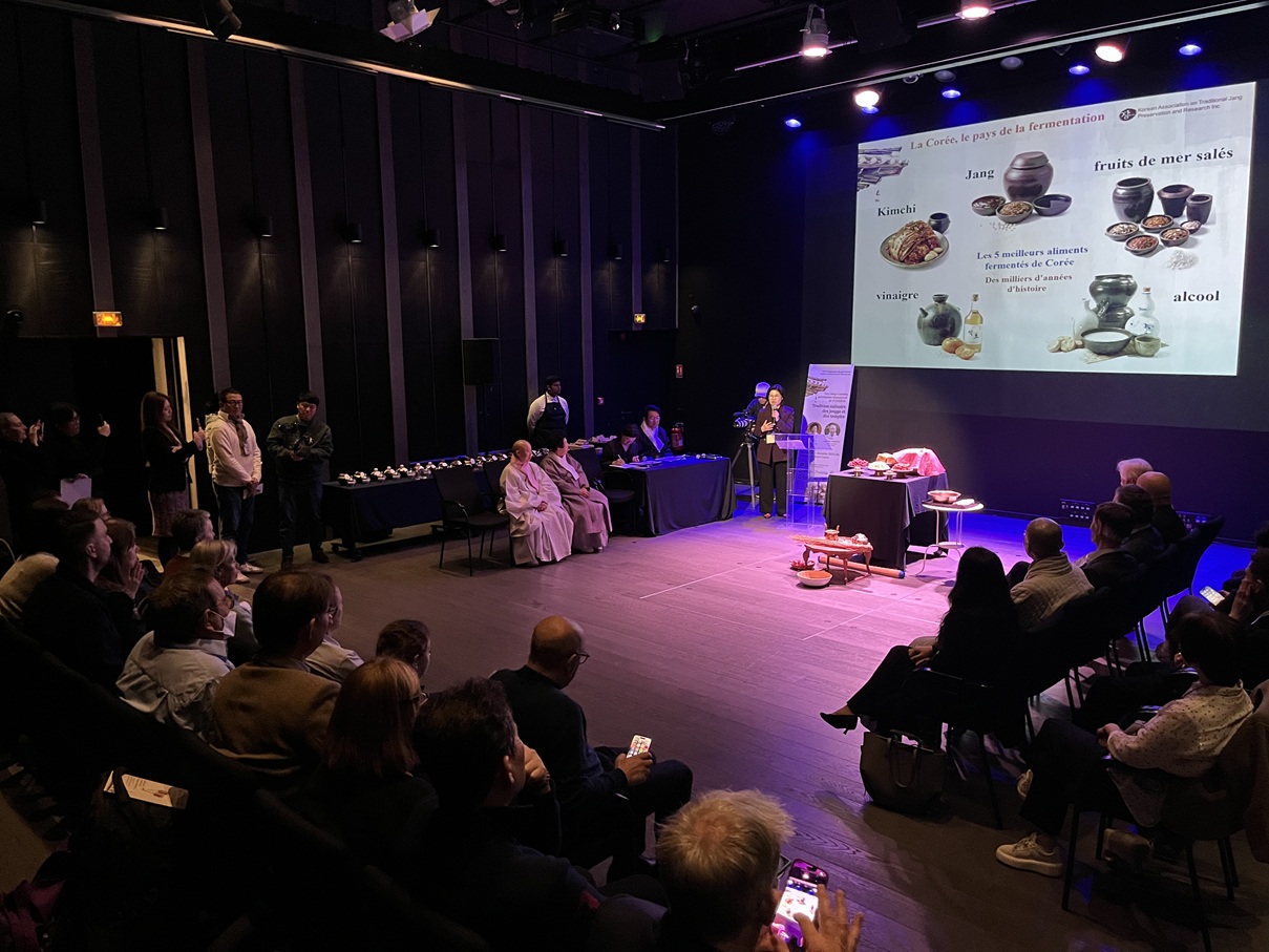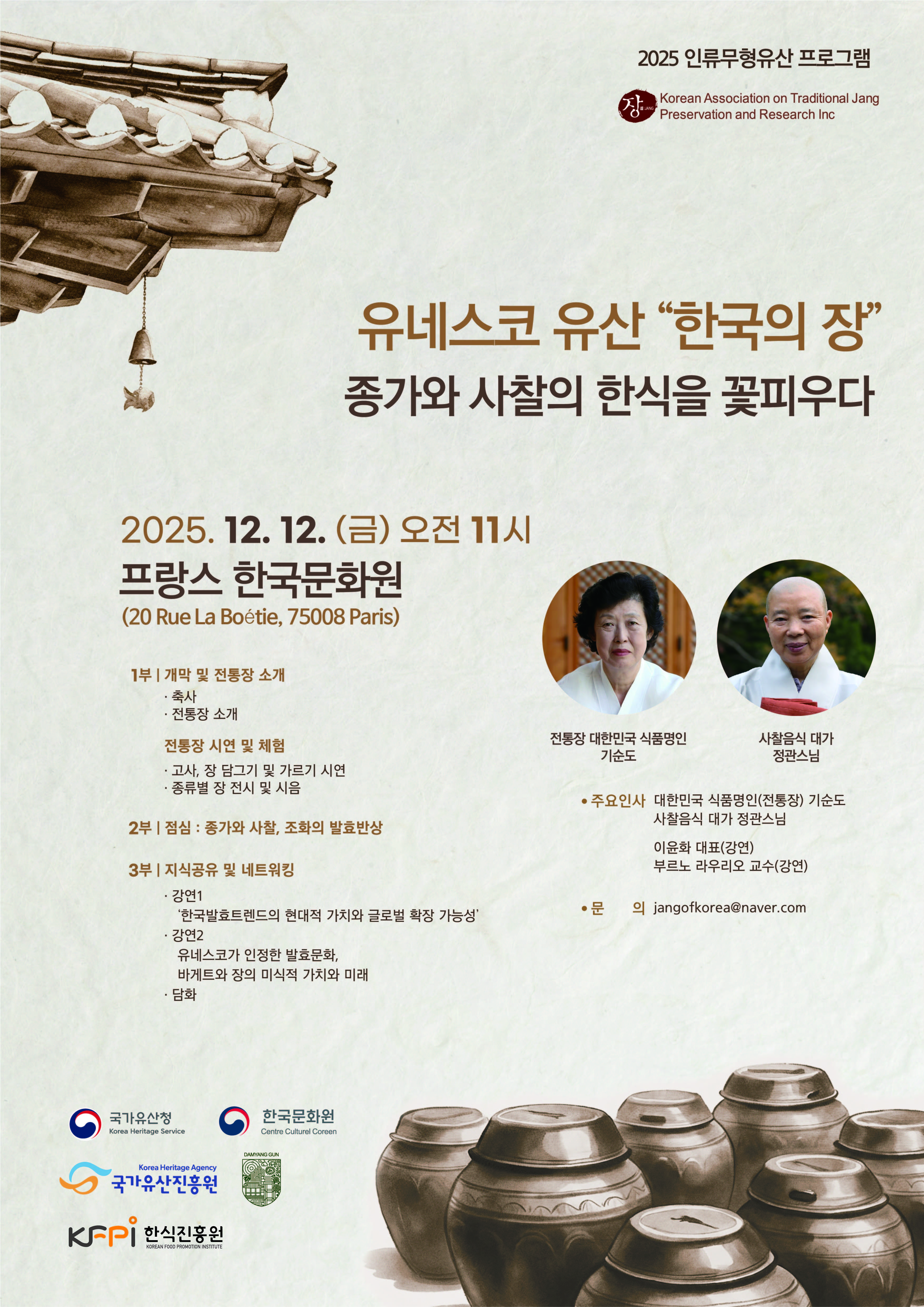 한국전통장보존연구회가 유네스코 인류무형유산 ‘한국의 장 담그기 문화’를 주제로 12월 12일(금) 오전 11시 프랑스 한국문화원에서 <유네스코 유산 '한국의 장' 종가와 사찰의 한식을 꽃 피우다> 행사를 개최하였습니다. 한국의 장 담그기는 2024년 유네스코 인류무형유산에 등재된 바 있어, 동 행사는 장 담그기 문화의 공동체적 전통과 의례적 의미를 전달하고 한국의 중요한 문화유산으로서의 가치를 홍보하는 기회가 되었습니다.