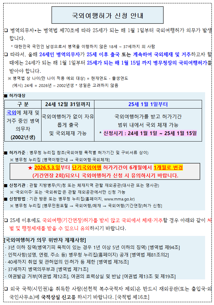 병역의무자는 병역법 제70조에 따라 25세가 되는 해 1월 1일부터 국외여행허가 의무가 발생합니다.