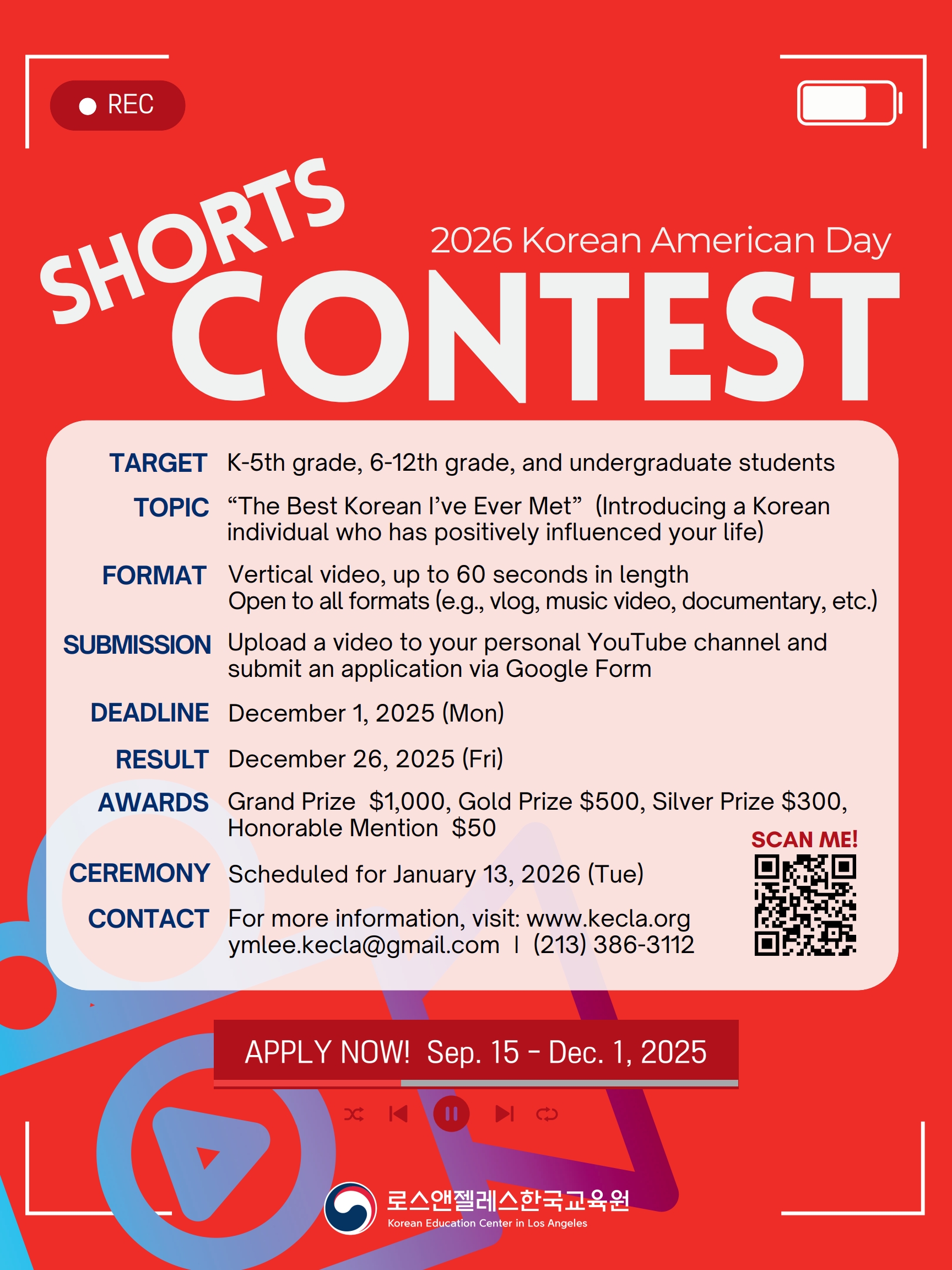 LA한국교육원에서는 다가오는 2026년도 미주한인의 날(1.13)을 맞아 아래와 같이 “2026 미주한인의 날 기념 쇼츠 공모전”을 개최합니다.