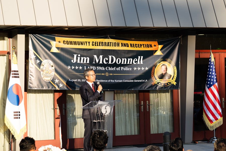 Consul General Youngwan Kim hosted a reception at the Consul General’s residence on Monday, August 25, to congratulate Jim McDonnell on his inauguration as the 59th Chief of the Los Angeles Police Department (LAPD). During the event, Consul General Kim emphasized the importance of continued cooperation and mutual trust between the LAPD and the Korean American community to ensure public safety, and extended his sincere congratulations to Chief McDonnell.