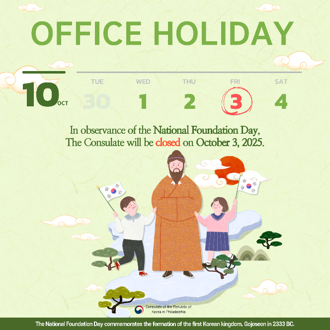 Please be advised that the Consulate of the Republic of Korea in Philadelphia will be closed on Friday, October 3, 2025 in observance of the Korean National Foundation Day.