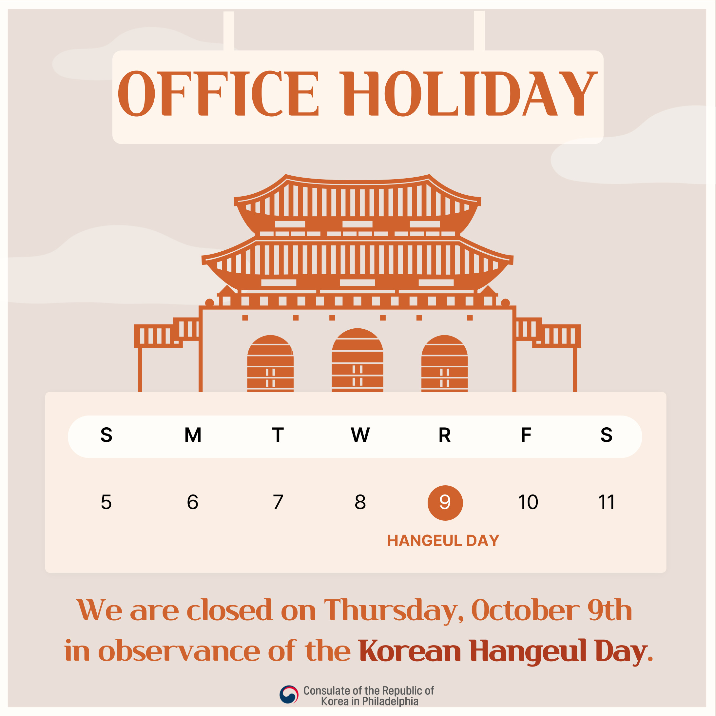 Please be advised that the Consulate of the Republic of Korea in Philadelphia will be closed on Thursday, October 9, 2025 in observance of the Hangeul Day.