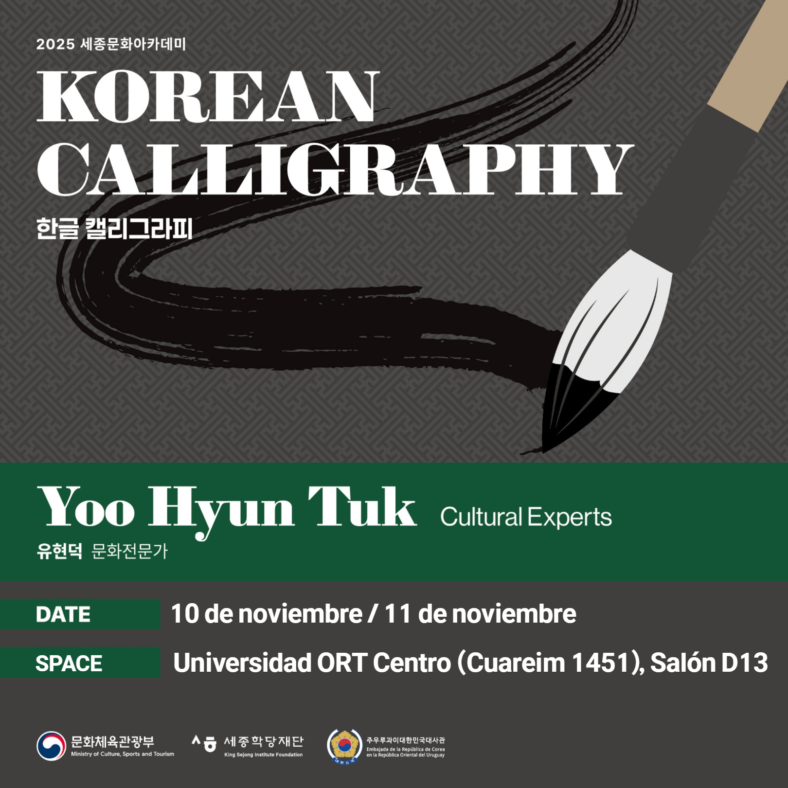 La Embajada de la República de Corea en el Uruguay, con el apoyo del Ministerio de Cultura, Deportes y Turismo y de la Fundación del Instituto Sejong, llevará a cabo el “Curso de Caligrafía de la Academia Cultural Sejong” los días 10 (domingo) y 11 (lunes) de noviembre. En esta ocasión, se contará con la participación del experto coreano en caligrafía Yoo Hyun-deok, quien dirigirá el taller bajo el tema “Mi familia y mis esperanzas expresadas en Hangeul”. Será una actividad práctica en la que los participantes podrán experimentar directamente, sin límite de cupos. Quienes deseen participar deberán inscribirse a través del siguiente enlace hasta el miércoles 29 de octubre a las 23:59.