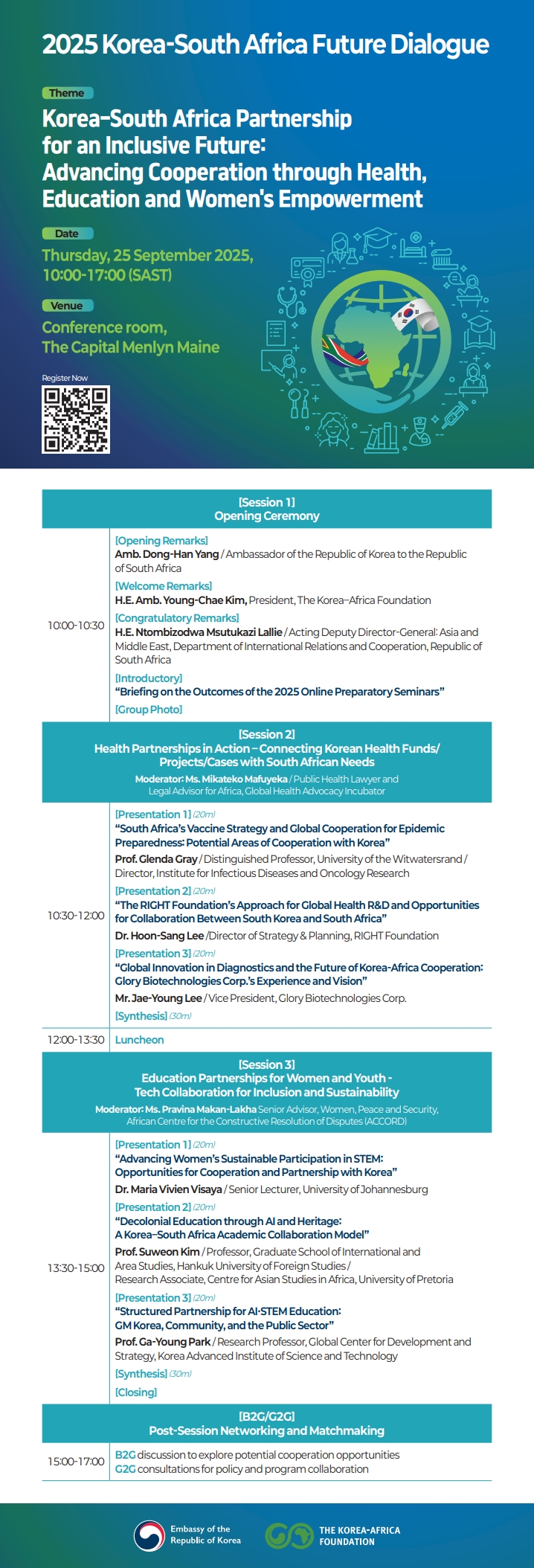 The Embassy of the Republic of Korea to the Republic of South Africa and the Korea-Africa Foundation are jointly hosting the "2025 Korea-South Africa Future Dialogue".
