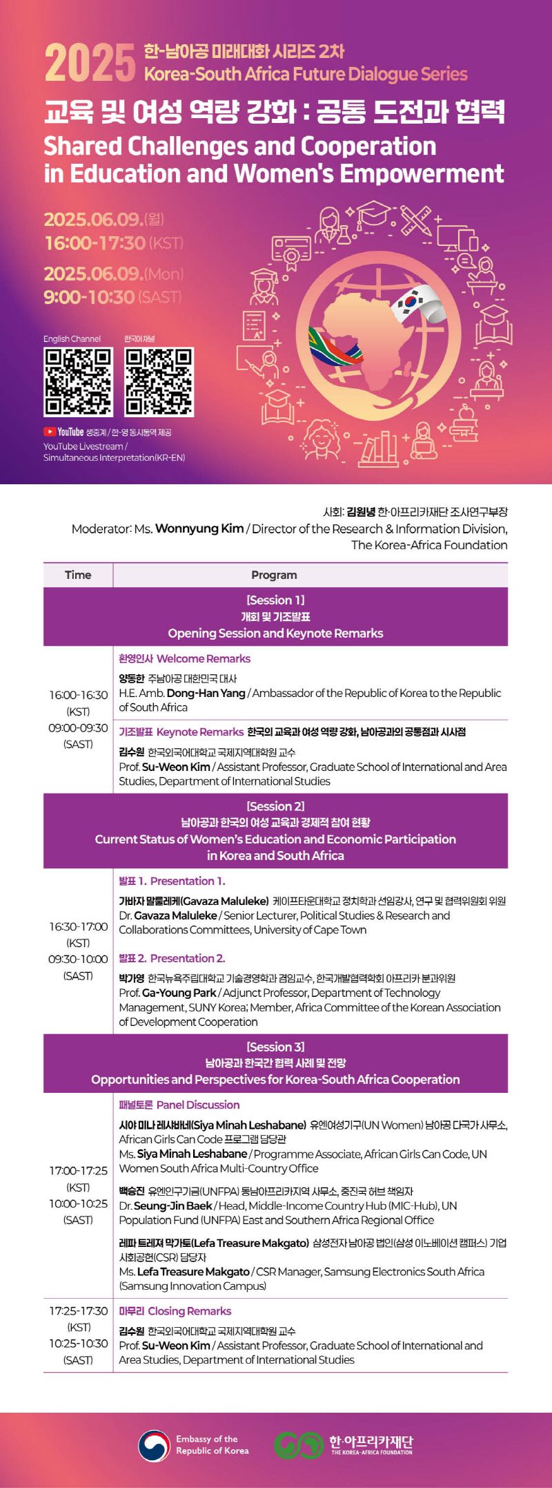주남아공한국대사관은 한아프리카재단과 공동으로 6.9(월) "2025 한-남아공 미래대화 시리즈: 교육 및 여성 역량강화-공통 도전과 협력" 온라인 간담회를 개최합니다.